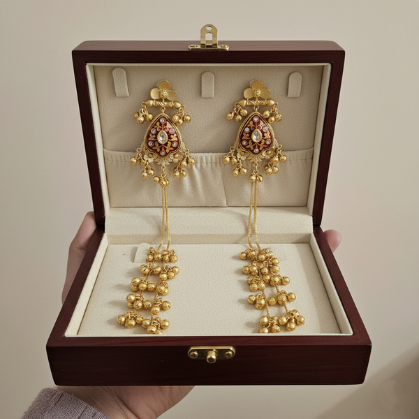 These elegant handcrafted long tassel earrings feature a rich teardrop-shaped centerpiece adorned with deep red meenakari enamel and sparkling kundan-style stones. The antique gold-toned base is enhanced with delicate ghungroo bead clusters around the motif and along the flowing tassel chains, adding graceful movement and a traditional charm. The floral-inspired top stud blends seamlessly into the ornate drop, creating a regal ethnic look. Perfect for weddings, festive occasions, and traditional celebrations, these earrings pair beautifully with sarees, lehengas, and ethnic suits.