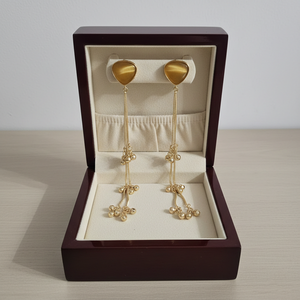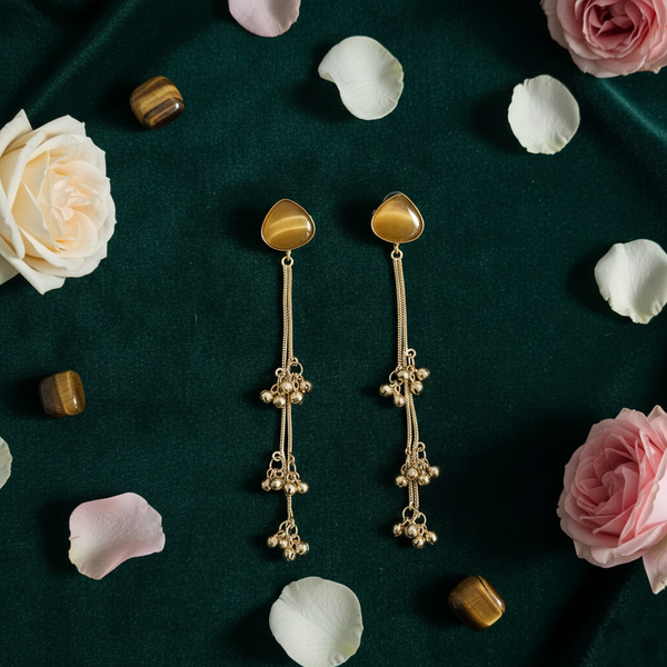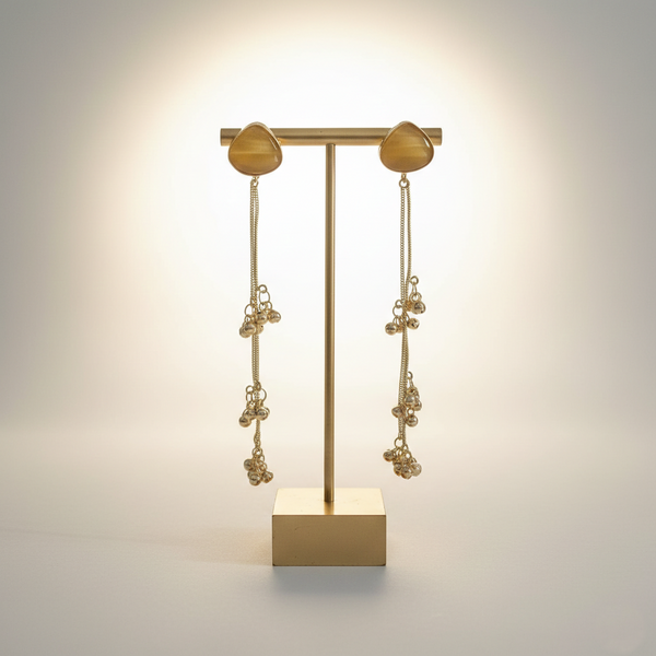 These elegant Kashmiri handcrafted long chain earrings showcase a minimal yet graceful ethnic design, featuring smooth honey-amber toned triangular stones set in an antique gold frame that create a soft warm glow, paired with slender cascading chains adorned with delicate clustered ghungroo bead drops placed at intervals to add gentle movement and a refined traditional charm. Designed with subtle detailing and lightweight craftsmanship, these earrings offer a perfect balance of simplicity and heritage appeal, making them ideal for festive styling, ethnic outfits, day functions, cultural occasions, and elegant gifting, while their handcrafted nature ensures each pair remains uniquely beautiful.
