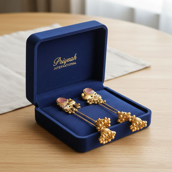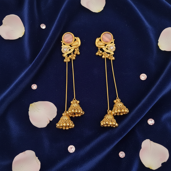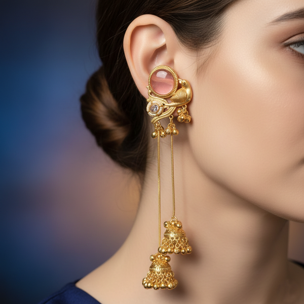 These traditional Kashmiri handcrafted long chain jhumka earrings feature an elegant peacock-inspired stud design highlighted with a soft rose-pink stone at the center, complemented by intricate gold-toned detailing and subtle crystal accents, followed by graceful double chain drops ending in beautifully crafted antique gold jhumkas with ghungroo bead detailing that create rich movement and a classic ethnic sound. Crafted with fine Kashmiri artistry and detailed metalwork, these earrings reflect timeless royal elegance and cultural heritage, making them an ideal choice for weddings, bridal wear, festive occasions, and traditional celebrations, with each handcrafted pair offering a unique and authentic character.