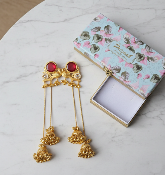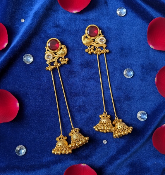 Kashmiri Ruby Stone Peacock Long Chain Jhumka Earrings in Antique Gold – Priyeah International
