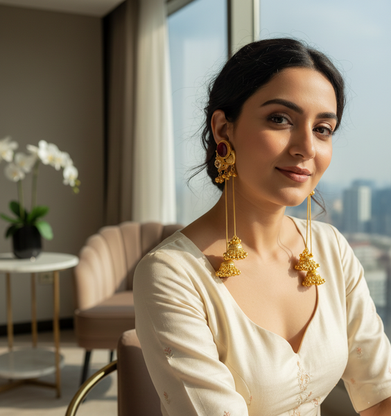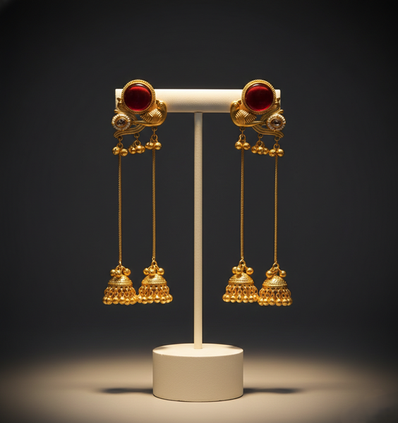 These traditional Kashmiri handcrafted long chain jhumka earrings feature a regal peacock-inspired stud design highlighted with a deep ruby red stone at the center, complemented by intricate gold-toned detailing and small crystal accents, followed by elegant double chain drops ending in beautifully crafted antique gold jhumkas with ghungroo bead detailing that create graceful movement and a rich traditional charm. Crafted with fine Kashmiri artistry and detailed metalwork, these earrings reflect royal elegance and cultural heritage, making them a perfect choice for weddings, bridal wear, festive occasions, and traditional celebrations, with each handcrafted pair carrying its own unique and authentic character.