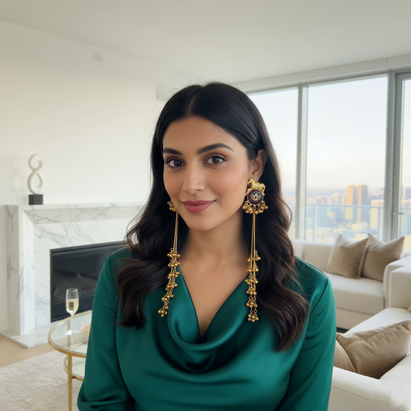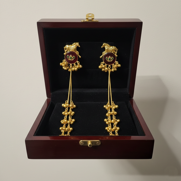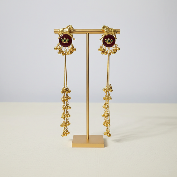 These exquisite Kashmiri handcrafted long earrings showcase a regal horse motif at the top, symbolizing strength and heritage, beautifully paired with a round stud adorned in deep ruby red enamel and subtle green meenakari detailing. The design flows into layered antique gold chains finished with multiple traditional ghungroo bead clusters that create graceful movement and a soft ethnic sound with every step. Rich in detailing yet elegant in form, these earrings reflect authentic Kashmiri artistry and are perfect for adding a royal touch to bridal wear, weddings, festive occasions, cultural celebrations, and statement ethnic styling, making them a standout piece in any traditional jewelry collection.