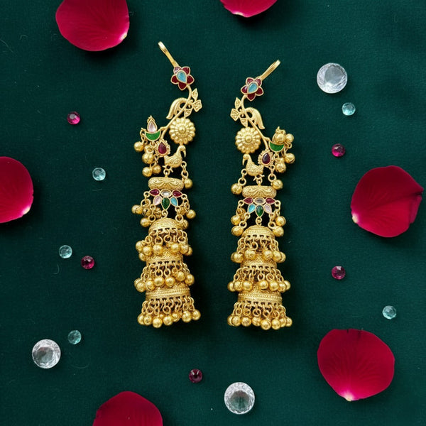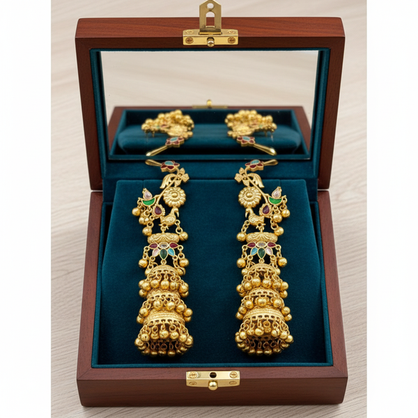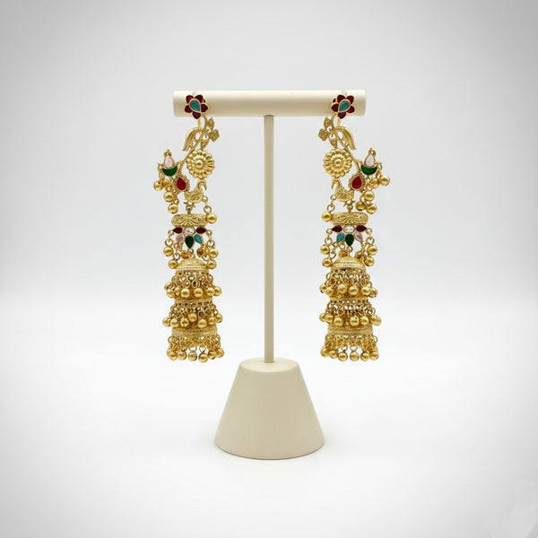 Product Description: These exquisite Kashmiri handcrafted jhumka earrings showcase rich traditional artistry with detailed floral and paisley-inspired motifs. The design features elegant multicolor enamel accents in ruby red and emerald green tones, beautifully balanced with antique gold detailing. The layered jhumka structure is enhanced with multiple tiny gold-toned bead drops that create a graceful sound and movement, adding classic ethnic charm. Inspired by authentic Kashmiri craftsmanship, these earrings reflect heritage elegance and fine detailing. Ideal for weddings, festive occasions, cultural celebrations, and traditional wear, this statement pair adds a regal touch to any ethnic outfit. Each piece is handcrafted, making every pair unique and special.